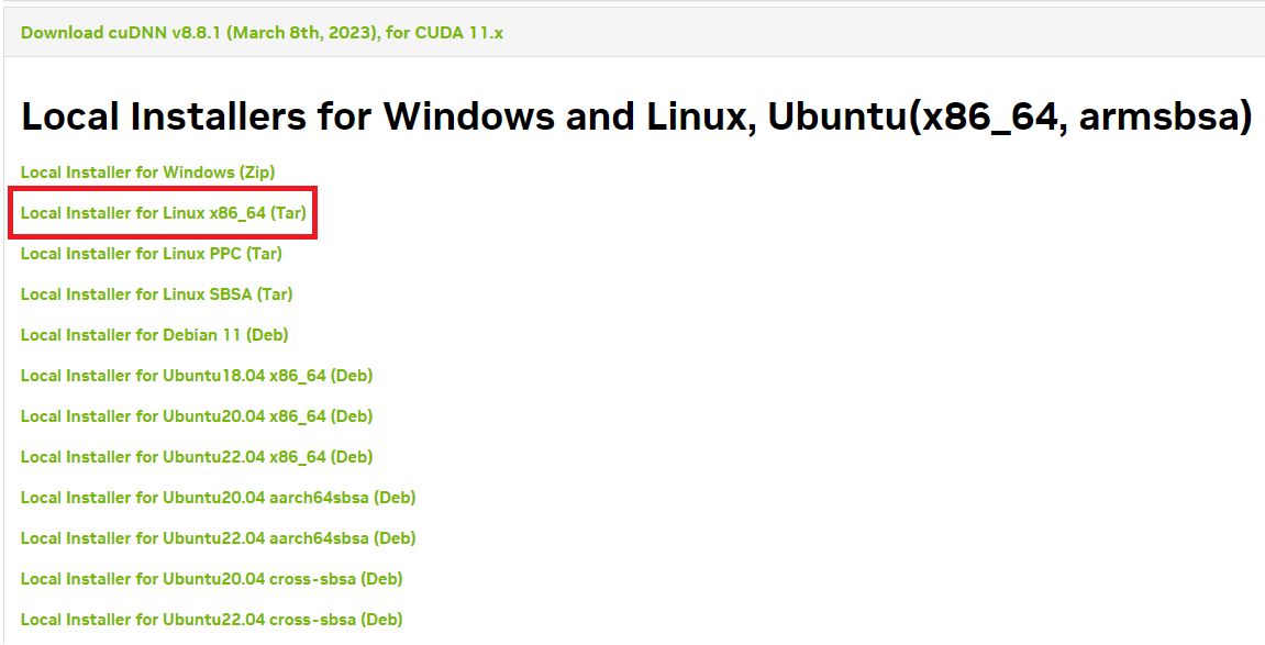 나의 경우 CUDA 11.7을 설치했기 때문에 11.x 리눅스용으로 다운로드
