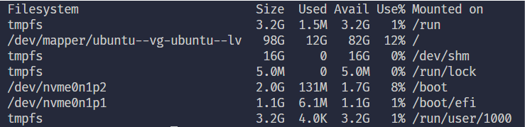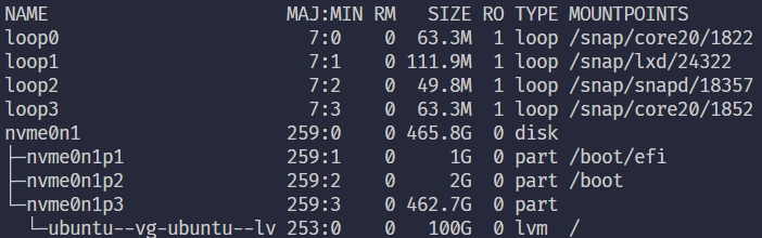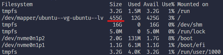 그 중 하나가 /dev/mapper/ubuntu--vg-ubuntu--lv 로 나와있는데 전체 메모리 중에 100G 밖에 안잡힘